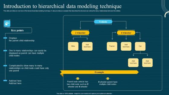 This slide provides an overview of the hierarchical data modeling technique. It also provides an example that describes the structure as well as the many relationships between the entities. Presenting this PowerPoint presentation, titled Database Modeling Structures Introduction To Hierarchical Data Modeling Technique Guidelines Pdf, with topics curated by our researchers after extensive research. This editable presentation is available for immediate download and provides attractive features when used. Download now and captivate your audience. Presenting this Database Modeling Structures Introduction To Hierarchical Data Modeling Technique Guidelines Pdf. Our researchers have carefully researched and created these slides with all aspects taken into consideration. This is a completely customizable Database Modeling Structures Introduction To Hierarchical Data Modeling Technique Guidelines Pdf that is available for immediate downloading. Download now and make an impact on your audience. Highlight the attractive features available with our PPTs. This slide provides an overview of the hierarchical data modeling technique. It also provides an example that describes the structure as well as the many relationships between the entities.