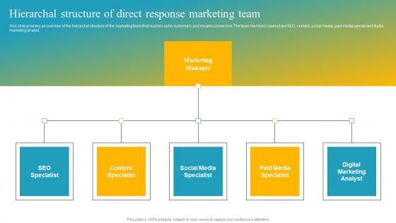 This slide provides an overview of the hierarchal structure of the marketing team that reaches out to customers and ensures conversion. The team members covered are SEO, content, social media, paid media special and digital marketing analyst. Welcome to our selection of the Direct Response Marketing Guide Ultimate Success Hierarchal Structure Of Direct Response Microsoft PDF. These are designed to help you showcase your creativity and bring your sphere to life. Planning and Innovation are essential for any business that is just starting out. This collection contains the designs that you need for your everyday presentations. All of our PowerPoints are 100 percent editable, so you can customize them to suit your needs. This multi-purpose template can be used in various situations. Grab these presentation templates today