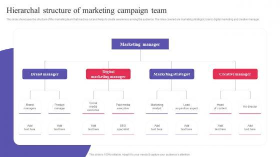 This slide showcases the structure of the marketing team that reaches out and helps to create awareness among the audience. The roles covered are marketing strategist, brand, digital marketing and creative manager. Retrieve professionally designed Guide To Create Advertising Campaign For Client Engagement Hierarchal Structure Of Marketing Campaign Team Introduction PDF to effectively convey your message and captivate your listeners. Save time by selecting pre-made slideshows that are appropriate for various topics, from business to educational purposes. These themes come in many different styles, from creative to corporate, and all of them are easily adjustable and can be edited quickly. Access them as PowerPoint templates or as Google Slides themes. You do not have to go on a hunt for the perfect presentation because Slidegeeks got you covered from everywhere.