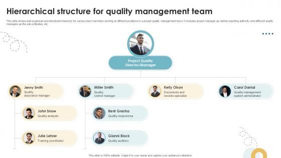 This slide shows well organized and structured hierarchy for various team members working at different positions in a project quality management team. It includes project manager as central reporting authority and different quality managers as the sub ordinates, etc. Make sure to capture your audiences attention in your business displays with our gratis customizable Hierarchical Structure For Quality Management Executing Quality Ppt Slides PM SS V. These are great for business strategies, office conferences, capital raising or task suggestions. If you desire to acquire more customers for your tech business and ensure they stay satisfied, create your own sales presentation with these plain slides. This slide shows well organized and structured hierarchy for various team members working at different positions in a project quality management team. It includes project manager as central reporting authority and different quality managers as the sub ordinates, etc.