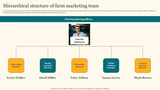 This slide provides an overview of the farm marketing team that promotes the products and services of the business and helps in lead conversion. Members covered in the marketing team are the chief marketing officer, advertising, market research and promotion director, public relations manager and creative services head. Are you searching for a Hierarchical Structure Of Farm Marketing Team Agricultural Product Promotion Professional Pdf that is uncluttered, straightforward, and original Its easy to edit, and you can change the colors to suit your personal or business branding. For a presentation that expresses how much effort you have put in, this template is ideal With all of its features, including tables, diagrams, statistics, and lists, its perfect for a business plan presentation. Make your ideas more appealing with these professional slides. Download Hierarchical Structure Of Farm Marketing Team Agricultural Product Promotion Professional Pdf from Slidegeeks today. This slide provides an overview of the farm marketing team that promotes the products and services of the business and helps in lead conversion. Members covered in the marketing team are the chief marketing officer, advertising, market research and promotion director, public relations manager and creative services head.
