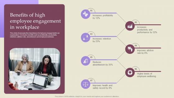 This slide showcases the importance of employee engagement in an organization. It includes benefits such as profitability, productivity, retention, attrition rate, absenteeism and employee wellness. Find a pre-designed and impeccable Employee Involvement Tactics Benefits Of High Employee Engagement In Workplace Summary Pdf. The templates can ace your presentation without additional effort. You can download these easy-to-edit presentation templates to make your presentation stand out from others. So, what are you waiting for Download the template from Slidegeeks today and give a unique touch to your presentation. This slide showcases the importance of employee engagement in an organization. It includes benefits such as profitability, productivity, retention, attrition rate, absenteeism and employee wellness.