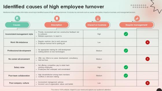 Mentioned slide provides information about major identified causes of high employee turnover. It includes key elements such as causes, description, impact on business, and management decision. Presenting this PowerPoint presentation, titled Web Consulting Business Identified Causes Of High Employee Turnover, with topics curated by our researchers after extensive research. This editable presentation is available for immediate download and provides attractive features when used. Download now and captivate your audience. Presenting this Web Consulting Business Identified Causes Of High Employee Turnover. Our researchers have carefully researched and created these slides with all aspects taken into consideration. This is a completely customizable Web Consulting Business Identified Causes Of High Employee Turnover that is available for immediate downloading. Download now and make an impact on your audience. Highlight the attractive features available with our PPTs. Mentioned slide provides information about major identified causes of high employee turnover. It includes key elements such as causes, description, impact on business, and management decision.