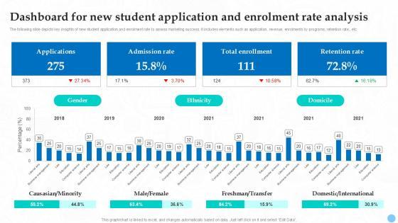 The following slide depicts key insights of new student application and enrolment rate to assess marketing success. It includes elements such as application, revenue, enrolments by programs, retention rate, etc. Crafting an eye-catching presentation has never been more straightforward. Let your presentation shine with this tasteful yet straightforward Dashboard For New Student Application Higher Education Ppt Sample Strategy SS V template. It offers a minimalistic and classy look that is great for making a statement. The colors have been employed intelligently to add a bit of playfulness while still remaining professional. Construct the ideal Dashboard For New Student Application Higher Education Ppt Sample Strategy SS V that effortlessly grabs the attention of your audience Begin now and be certain to wow your customers The following slide depicts key insights of new student application and enrolment rate to assess marketing success. It includes elements such as application, revenue, enrolments by programs, retention rate, etc.