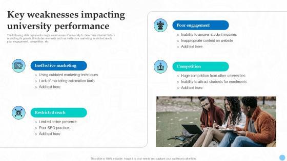 The following slide represents major weaknesses of university to determine internal factors restricting its growth. It includes elements such as ineffective marketing, restricted reach, poor engagement, competition, etc. The best PPT templates are a great way to save time, energy, and resources. Slidegeeks have 100 percent editable powerpoint slides making them incredibly versatile. With these quality presentation templates, you can create a captivating and memorable presentation by combining visually appealing slides and effectively communicating your message. Download Key Weaknesses Impacting University Higher Education Ppt Slides Strategy SS V from Slidegeeks and deliver a wonderful presentation. The following slide represents major weaknesses of university to determine internal factors restricting its growth. It includes elements such as ineffective marketing, restricted reach, poor engagement, competition, etc.