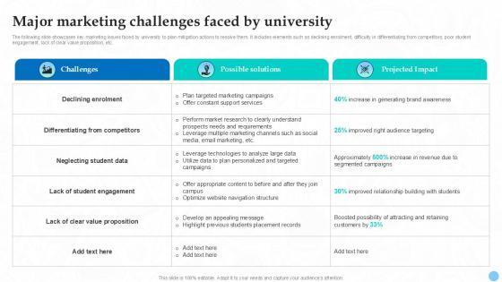 The following slide showcases key marketing issues faced by university to plan mitigation actions to resolve them. It includes elements such as declining enrolment, difficulty in differentiating from competitors, poor student engagement, lack of clear value proposition, etc. Are you searching for a Major Marketing Challenges Faced By University Higher Education Ppt Template Strategy SS V that is uncluttered, straightforward, and original Its easy to edit, and you can change the colors to suit your personal or business branding. For a presentation that expresses how much effort you have put in, this template is ideal With all of its features, including tables, diagrams, statistics, and lists, its perfect for a business plan presentation. Make your ideas more appealing with these professional slides. Download Major Marketing Challenges Faced By University Higher Education Ppt Template Strategy SS V from Slidegeeks today. The following slide showcases key marketing issues faced by university to plan mitigation actions to resolve them. It includes elements such as declining enrolment, difficulty in differentiating from competitors, poor student engagement, lack of clear value proposition, etc.