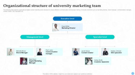 The following slide depicts organizational digital content marketing team structure to ensure effective communication and decision making. It includes elements such as marketing director, brand manager, communication manager, content creator, SEO specialist, etc. Slidegeeks has constructed Organizational Structure Of University Marketing Higher Education Ppt Sample Strategy SS V after conducting extensive research and examination. These presentation templates are constantly being generated and modified based on user preferences and critiques from editors. Here, you will find the most attractive templates for a range of purposes while taking into account ratings and remarks from users regarding the content. This is an excellent jumping-off point to explore our content and will give new users an insight into our top-notch PowerPoint Templates. The following slide depicts organizational digital content marketing team structure to ensure effective communication and decision making. It includes elements such as marketing director, brand manager, communication manager, content creator, SEO specialist, etc.