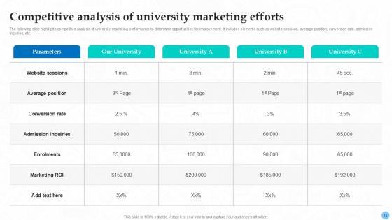 This Higher Education Marketing Plan To Improve Admission Rate PPT Sample Strategy CD V is a primer on how to capitalize on business opportunities through planning, innovation, and market intelligence. The content-ready format of the complete deck will make your job as a decision-maker a lot easier. Use this ready-made PowerPoint Template to help you outline an extensive and legible plan to capture markets and grow your company on the right path, at an exponential pace. What is even more amazing is that this presentation is completely editable and 100 percent customizable. This seventy five slide complete deck helps you impress a roomful of people with your expertise in business and even presentation. Craft such a professional and appealing presentation for that amazing recall value. Download now. Our Higher Education Marketing Plan To Improve Admission Rate PPT Sample Strategy CD V are topically designed to provide an attractive backdrop to any subject. Use them to look like a presentation pro.