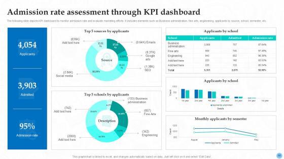 The following slide depicts KPI dashboard to monitor admission rate and evaluate marketing efforts. It includes elements such as Business administration, fine arts, engineering, applicants by source, school, semester, etc. Find a pre-designed and impeccable Admission Rate Assessment Through Kpi Higher Education Ppt Slides Strategy SS V. The templates can ace your presentation without additional effort. You can download these easy-to-edit presentation templates to make your presentation stand out from others. So, what are you waiting for Download the template from Slidegeeks today and give a unique touch to your presentation. The following slide depicts KPI dashboard to monitor admission rate and evaluate marketing efforts. It includes elements such as Business administration, fine arts, engineering, applicants by source, school, semester, etc.