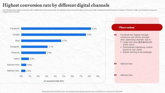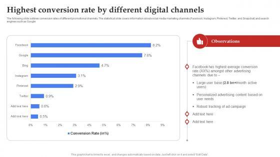 The following slide outlines conversion rates of different promotional channels. The statistical slide covers information about social media marketing channels Facebook, Instagram, Pinterest, Twitter, and Snapchat and search engines such as Google. Explore a selection of the finest Facebook Marketing Techniques Highest Conversion Rate By Different Digital Channels Strategy SS V here. With a plethora of professionally designed and pre-made slide templates, you can quickly and easily find the right one for your upcoming presentation. You can use our Facebook Marketing Techniques Highest Conversion Rate By Different Digital Channels Strategy SS V to effectively convey your message to a wider audience. Slidegeeks has done a lot of research before preparing these presentation templates. The content can be personalized and the slides are highly editable. Grab templates today from Slidegeeks. The following slide outlines conversion rates of different promotional channels. The statistical slide covers information about social media marketing channels Facebook, Instagram, Pinterest, Twitter, and Snapchat and search engines such as Google