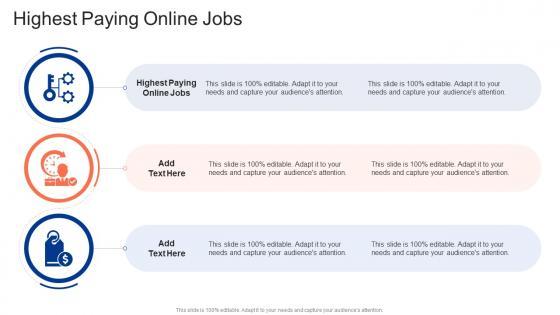 Presenting our innovatively-designed set of slides titled Highest Paying Online Jobs In Powerpoint And Google Slides Cpb. This completely editable PowerPoint graphic exhibits Highest Paying Online Jobs that will help you convey the message impactfully. It can be accessed with Google Slides and is available in both standard screen and widescreen aspect ratios. Apart from this, you can download this well-structured PowerPoint template design in different formats like PDF, JPG, and PNG. So, click the download button now to gain full access to this PPT design. Our Highest Paying Online Jobs In Powerpoint And Google Slides Cpb are topically designed to provide an attractive backdrop to any subject. Use them to look like a presentation pro.