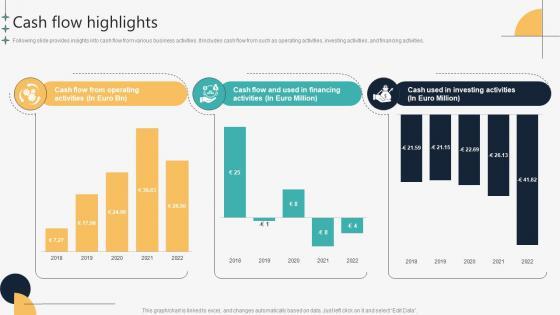 Following slide provides insights into cash flow from various business activities. It includes cash flow from such as operating activities, investing activities, and financing activities.There are so many reasons you need a Cash Flow Highlights Automotive Manufacturing Company Profile CP SS V. The first reason is you can not spend time making everything from scratch, Thus, Slidegeeks has made presentation templates for you too. You can easily download these templates from our website easily. Following slide provides insights into cash flow from various business activities. It includes cash flow from such as operating activities, investing activities, and financing activities.