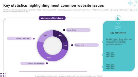 The following slide showcases a graphical representation of major website issues faced by the healthcare organizations. No Hypertext Transfer Protocol HTTPS, broken links, outdated website design and slow load web page are the problems which are outlined in the slide. The Key Statistics Highlighting Most Common Website Issues Diagrams PDF is a compilation of the most recent design trends as a series of slides. It is suitable for any subject or industry presentation, containing attractive visuals and photo spots for businesses to clearly express their messages. This template contains a variety of slides for the user to input data, such as structures to contrast two elements, bullet points, and slides for written information. Slidegeeks is prepared to create an impression.