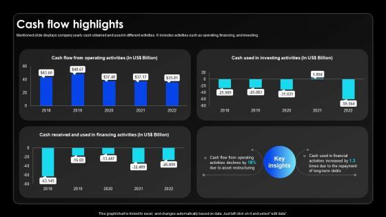 Mentioned slide displays company yearly cash obtained and used in different activities. It includes activities such as operating, financing, and investing.Slidegeeks is one of the best resources for PowerPoint templates. You can download easily and regulate Cash Flow Highlights Wireless Communication Services Provider Company Profile CP SS V for your personal presentations from our wonderful collection. A few clicks is all it takes to discover and get the most relevant and appropriate templates. Use our Templates to add a unique zing and appeal to your presentation and meetings. All the slides are easy to edit and you can use them even for advertisement purposes. Mentioned slide displays company yearly cash obtained and used in different activities. It includes activities such as operating, financing, and investing.