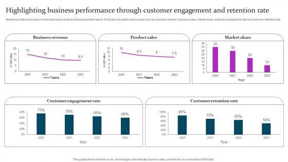 Mentioned slide showcases current declining scenarios of business performance. It includes key performance areas such as business revenue, business sales, market share, customer engagement rate and customer retention rate. Slidegeeks is here to make your presentations a breeze with Highlighting Business Performance Marketing Mix Communication Guide Client Elements Pdf With our easy to use and customizable templates, you can focus on delivering your ideas rather than worrying about formatting. With a variety of designs to choose from, you are sure to find one that suits your needs. And with animations and unique photos, illustrations, and fonts, you can make your presentation pop. So whether you are giving a sales pitch or presenting to the board, make sure to check out Slidegeeks first Mentioned slide showcases current declining scenarios of business performance. It includes key performance areas such as business revenue, business sales, market share, customer engagement rate and customer retention rate.