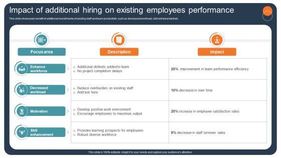 This slide showcases benefit of additional recruitments of existing staff and team productivity such as decreased workload, skill enhancement etc. Explore a selection of the finest Strategic Staffing Using Data Impact Of Additional Hiring On Existing Employees CRP DK SS V here. With a plethora of professionally designed and pre-made slide templates, you can quickly and easily find the right one for your upcoming presentation. You can use our Strategic Staffing Using Data Impact Of Additional Hiring On Existing Employees CRP DK SS V to effectively convey your message to a wider audience. Slidegeeks has done a lot of research before preparing these presentation templates. The content can be personalized and the slides are highly editable. Grab templates today from Slidegeeks. This slide showcases benefit of additional recruitments of existing staff and team productivity such as decreased workload, skill enhancement etc.