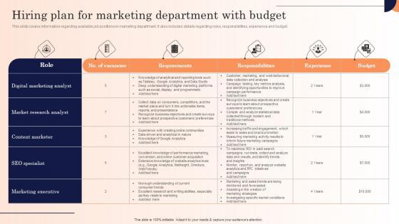 This slide covers information regarding available job positions in marketing department. It also includes details regarding roles, responsibilities, experience and budget. Are you in need of a template that can accommodate all of your creative concepts This one is crafted professionally and can be altered to fit any style. Use it with Google Slides or PowerPoint. Include striking photographs, symbols, depictions, and other visuals. Fill, move around, or remove text boxes as desired. Test out color palettes and font mixtures. Edit and save your work, or work with colleagues. Download Hiring Plan For Marketing Department With Budget Strategic Marketing Campaign Diagrams Pdf and observe how to make your presentation outstanding. Give an impeccable presentation to your group and make your presentation unforgettable. This slide covers information regarding available job positions in marketing department. It also includes details regarding roles, responsibilities, experience and budget.