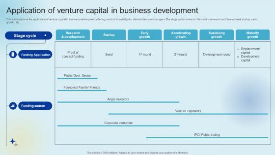 This slide explores the application of venture capital in business development, offering practical knowledge for stakeholders and managers. The stage cycle covered in the slide is research and development, startup, early growth, etc. Want to ace your presentation in front of a live audience Our Application Of Venture Capital In Business Raising Venture Capital A Holistic Approach Fin SS V can help you do that by engaging all the users towards you. Slidegeeks experts have put their efforts and expertise into creating these impeccable powerpoint presentations so that you can communicate your ideas clearly. Moreover, all the templates are customizable, and easy-to-edit and downloadable. Use these for both personal and commercial use. This slide explores the application of venture capital in business development, offering practical knowledge for stakeholders and managers. The stage cycle covered in the slide is research and development, startup, early growth, etc.