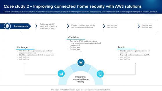 This slide exhibits case study showcasing how AWS solutions helps consumer product company in enhancing connected home products security. It includes elements such as business goals, challenges, IoT solutions, and results. Do you have an important presentation coming up Are you looking for something that will make your presentation stand out from the rest Look no further than Building Trust With IoT Security Case Study 2 Improving Connected Home Security With Aws IoT SS V. With our professional designs, you can trust that your presentation will pop and make delivering it a smooth process. And with Slidegeeks, you can trust that your presentation will be unique and memorable. So why wait Grab Building Trust With IoT Security Case Study 2 Improving Connected Home Security With Aws IoT SS V today and make your presentation stand out from the rest This slide exhibits case study showcasing how AWS solutions helps consumer product company in enhancing connected home products security. It includes elements such as business goals, challenges, IoT solutions, and results.