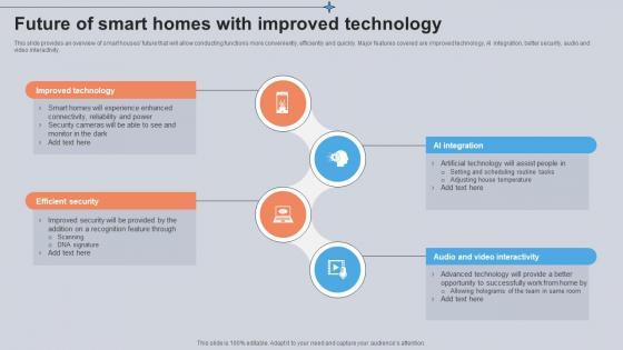 This slide provides an overview of smart houses future that will allow conducting functions more conveniently, efficiently and quickly. Major features covered are improved technology, AI integration, better security, audio and video interactivity. Explore a selection of the finest Future Of Smart Homes With Improved Technology Utilizing Smart Appliances IoT SS V here. With a plethora of professionally designed and pre-made slide templates, you can quickly and easily find the right one for your upcoming presentation. You can use our Future Of Smart Homes With Improved Technology Utilizing Smart Appliances IoT SS V to effectively convey your message to a wider audience. Slidegeeks has done a lot of research before preparing these presentation templates. The content can be personalized and the slides are highly editable. Grab templates today from Slidegeeks. This slide provides an overview of smart houses future that will allow conducting functions more conveniently, efficiently and quickly. Major features covered are improved technology, AI integration, better security, audio and video interactivity.