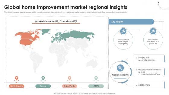 This slide showcases regional assessment for home improvement loan market with key insights and market restraints which includes length loan process, low home values etc. Formulating a presentation can take up a lot of effort and time, so the content and message should always be the primary focus. The visuals of the PowerPoint can enhance the presenters message, so our Global Home Improvement Market Global Consumer Financial Ppt Template CRP DK SS V was created to help save time. Instead of worrying about the design, the presenter can concentrate on the message while our designers work on creating the ideal templates for whatever situation is needed. Slidegeeks has experts for everything from amazing designs to valuable content, we have put everything into Global Home Improvement Market Global Consumer Financial Ppt Template CRP DK SS V This slide showcases regional assessment for home improvement loan market with key insights and market restraints which includes length loan process, low home values etc.