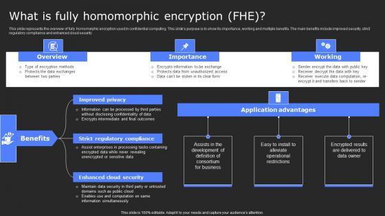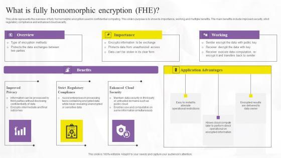 This slide represents the overview of fully homomorphic encryption used in confidential computing. This slides purpose is to show its importance, working and multiple benefits. The main benefits include improved security, strict regulatory compliance and enhanced cloud security. Coming up with a presentation necessitates that the majority of the effort goes into the content and the message you intend to convey. The visuals of a PowerPoint presentation can only be effective if it supplements and supports the story that is being told. Keeping this in mind our experts created Confidential Computing System Technology What Is Fully Homomorphic Encryption Fhe Slides PDF to reduce the time that goes into designing the presentation. This way, you can concentrate on the message while our designers take care of providing you with the right template for the situation.