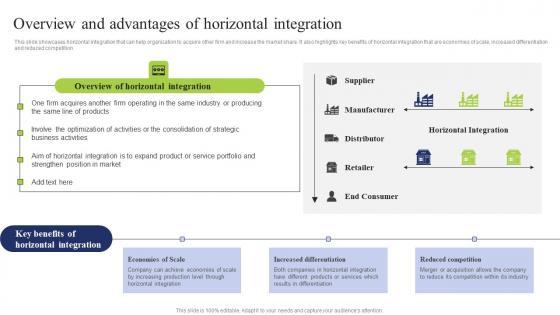 This slide showcases horizontal integration that can help organization to acquire other firm and increase the market share. It also highlights key benefits of horizontal integration that are economies of scale, increased differentiation and reduced competition. Whether you have daily or monthly meetings, a brilliant presentation is necessary. Overview And Advantages Of Horizontal Integration Rules PDF can be your best option for delivering a presentation. Represent everything in detail using Overview And Advantages Of Horizontal Integration Rules PDF and make yourself stand out in meetings. The template is versatile and follows a structure that will cater to your requirements. All the templates prepared by Slidegeeks are easy to download and edit. Our research experts have taken care of the corporate themes as well. So, give it a try and see the results.