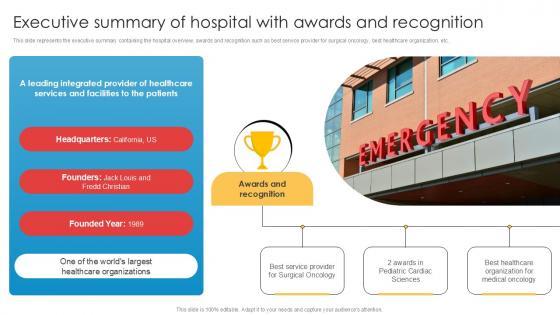 This slide represents the executive summary containing the hospital overview, awards and recognition such as best service provider for surgical oncology, best healthcare organization, etc. If your project calls for a presentation, then Slidegeeks is your go-to partner because we have professionally designed, easy-to-edit templates that are perfect for any presentation. After downloading, you can easily edit Executive Summary Of Hospital With Awards Implementation Of Online Ppt Sample and make the changes accordingly. You can rearrange slides or fill them with different images. Check out all the handy templates This slide represents the executive summary containing the hospital overview, awards and recognition such as best service provider for surgical oncology, best healthcare organization, etc.
