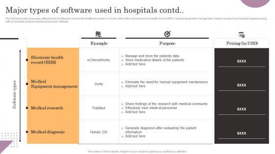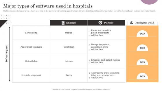 The following slide showcases various software used in day-to-day operations. E-prescribing, appointment scheduling, medical billing and hospital management are some of the major softwares which are mentioned in the slide. Here you can discover an assortment of the finest PowerPoint and Google Slides templates. With these templates, you can create presentations for a variety of purposes while simultaneously providing your audience with an eye-catching visual experience. Download Major Types Of Software Used In Hospitals General Management Graphics Pdf to deliver an impeccable presentation. These templates will make your job of preparing presentations much quicker, yet still, maintain a high level of quality. Slidegeeks has experienced researchers who prepare these templates and write high-quality content for you. Later on, you can personalize the content by editing the Major Types Of Software Used In Hospitals General Management Graphics Pdf. The following slide showcases various software used in day-to-day operations. E-prescribing, appointment scheduling, medical billing and hospital management are some of the major softwares which are mentioned in the slide.