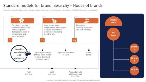 This slide provides information regarding standard models for brand hierarchy in terms of house of brands along with benefits associated with the approach. Slidegeeks is one of the best resources for PowerPoint templates. You can download easily and regulate v for your personal presentations from our wonderful collection. A few clicks is all it takes to discover and get the most relevant and appropriate templates. Use our Templates to add a unique zing and appeal to your presentation and meetings. All the slides are easy to edit and you can use them even for advertisement purposes.