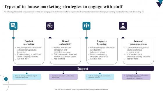 The following slide exhibits various approaches which aim to engage and satisfy internal staff of an organisation. It involves information related to employer branding, brand authenticity, product marketing, etc. Showcasing this set of slides titled Types Of In House Marketing Strategies To Engage With Staff Summary Pdf. The topics addressed in these templates are Product Marketing, Brand Authenticity, Employer Branding. All the content presented in this PPT design is completely editable. Download it and make adjustments in color, background, font etc. as per your unique business setting. The following slide exhibits various approaches which aim to engage and satisfy internal staff of an organisation. It involves information related to employer branding, brand authenticity, product marketing, etc.
