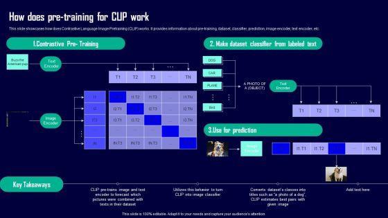 This slide showcases how does Contrastive Language Image Pretraining CLIP works. It provides information about pre-training, dataset, classifier, prediction, image encoder, text encoder, etc. Do you have an important presentation coming up Are you looking for something that will make your presentation stand out from the rest Look no further than How Does Pre Training For Clip Work Creative Applications For Open AI Designs Pdf. With our professional designs, you can trust that your presentation will pop and make delivering it a smooth process. And with Slidegeeks, you can trust that your presentation will be unique and memorable. So why wait Grab How Does Pre Training For Clip Work Creative Applications For Open AI Designs Pdf today and make your presentation stand out from the rest. This slide showcases how does Contrastive Language Image Pretraining CLIP works. It provides information about pre-training, dataset, classifier, prediction, image encoder, text encoder, etc.