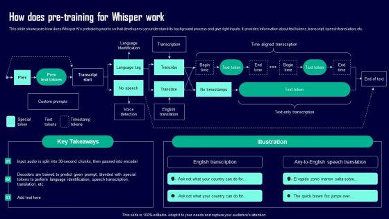 This slide showcases how does Whisper AIs pretraining works so that developers can understand its background process and give right inputs. It provides information about text tokens, transcript, speech translation, etc. Whether you have daily or monthly meetings, a brilliant presentation is necessary. How Does Pre Training For Whisper Work Creative Applications For Open AI Diagrams Pdf can be your best option for delivering a presentation. Represent everything in detail using How Does Pre Training For Whisper Work Creative Applications For Open AI Diagrams Pdf and make yourself stand out in meetings. The template is versatile and follows a structure that will cater to your requirements. All the templates prepared by Slidegeeks are easy to download and edit. Our research experts have taken care of the corporate themes as well. So, give it a try and see the results. This slide showcases how does Whisper AIs pretraining works so that developers can understand its background process and give right inputs. It provides information about text tokens, transcript, speech translation, etc.