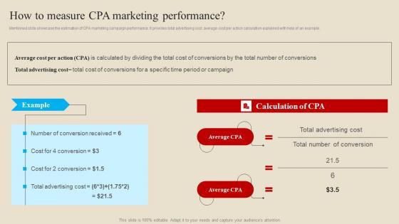 Mentioned slide showcase the estimation of CPA marketing campaign performance. It provides total advertising cost, average cost per action calculation explained with help of an example. Presenting this PowerPoint presentation, titled Strategies For Implementing CPA Marketing How To Measure CPA Marketing Performance Portrait PDF, with topics curated by our researchers after extensive research. This editable presentation is available for immediate download and provides attractive features when used. Download now and captivate your audience. Presenting this Strategies For Implementing CPA Marketing How To Measure CPA Marketing Performance Portrait PDF. Our researchers have carefully researched and created these slides with all aspects taken into consideration. This is a completely customizable Strategies For Implementing CPA Marketing How To Measure CPA Marketing Performance Portrait PDF that is available for immediate downloading. Download now and make an impact on your audience. Highlight the attractive features available with our PPTs.