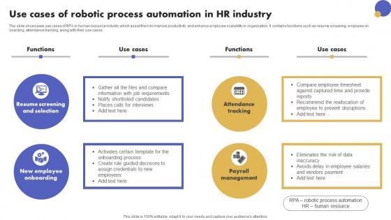 The slide showcases use cases of RPA in human resource industry which assist them to improve productivity and enhance employee scalability in organization. It contains functions such as resume screening, employee on boarding, attendance tracking, along with their use cases.Showcasing this set of slides titled Use Cases Of Robotic Process Automation In Hr Industry Portrait Pdf The topics addressed in these templates are Resume Screening, Employee Salaries, Vendors Payment All the content presented in this PPT design is completely editable. Download it and make adjustments in color, background, font etc. as per your unique business setting. The slide showcases use cases of RPA in human resource industry which assist them to improve productivity and enhance employee scalability in organization. It contains functions such as resume screening, employee on boarding, attendance tracking, along with their use cases.