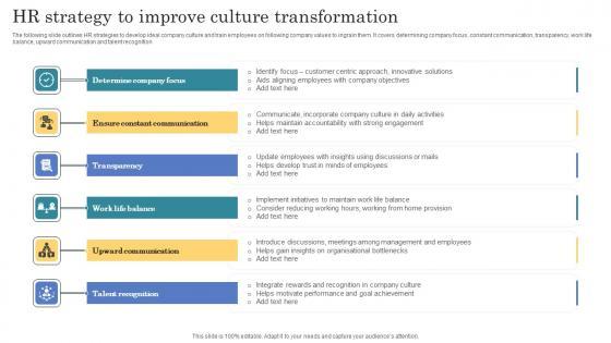 The following slide outlines HR strategies to develop ideal company culture and train employees on following company values to ingrain them. It covers determining company focus, constant communication, transparency, work life balance, upward communication and talent recognition Pitch your topic with ease and precision using this HR Strategy To Improve Culture Transformation Graphics Pdf. This layout presents information on Communication, Transparency, Balance. It is also available for immediate download and adjustment. So, changes can be made in the color, design, graphics or any other component to create a unique layout. The following slide outlines HR strategies to develop ideal company culture and train employees on following company values to ingrain them. It covers determining company focus, constant communication, transparency, work life balance, upward communication and talent recognition