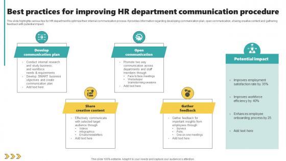 This slide highlights various tips for HR department to optimize their internal communication process. It provides information regarding developing communication plan, open communication, sharing creative content and gathering feedback with potential impact. Pitch your topic with ease and precision using this Best Practices For Improving HR Department Communication Procedure Rules Pdf. This layout presents information on Developing Communication Plan, Open Communication, Sharing Creative Content. It is also available for immediate download and adjustment. So, changes can be made in the color, design, graphics or any other component to create a unique layout. This slide highlights various tips for HR department to optimize their internal communication process. It provides information regarding developing communication plan, open communication, sharing creative content and gathering feedback with potential impact.