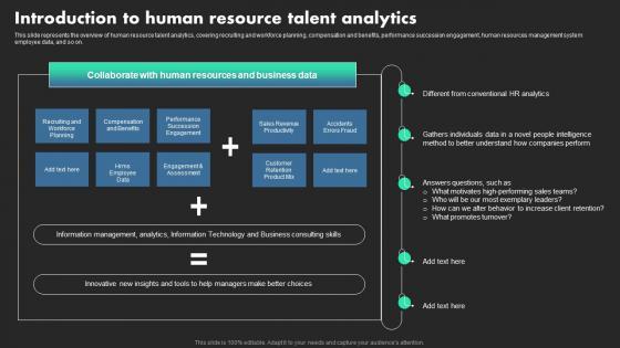 This slide represents the overview of human resource talent analytics, covering recruiting and workforce planning, compensation and benefits, performance succession engagement, human resources management system employee data, and so on. Presenting this PowerPoint presentation, titled Introduction To Human Resource Talent Analytics Ethical Dimensions Of Datafication Ideas Pdf with topics curated by our researchers after extensive research. This editable presentation is available for immediate download and provides attractive features when used. Download now and captivate your audience. Presenting this Introduction To Human Resource Talent Analytics Ethical Dimensions Of Datafication Ideas Pdf Our researchers have carefully researched and created these slides with all aspects taken into consideration. This is a completely customizable Introduction To Human Resource Talent Analytics Ethical Dimensions Of Datafication Ideas Pdf that is available for immediate downloading. Download now and make an impact on your audience. Highlight the attractive features available with our PPTs. This slide represents the overview of human resource talent analytics, covering recruiting and workforce planning, compensation and benefits, performance succession engagement, human resources management system employee data, and so on.