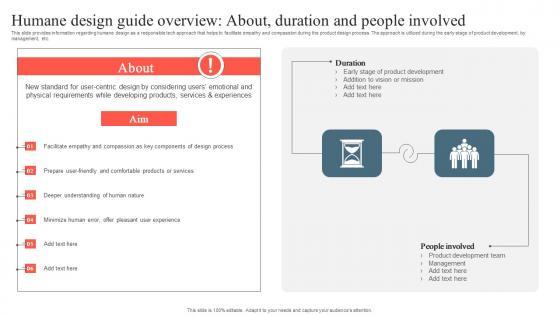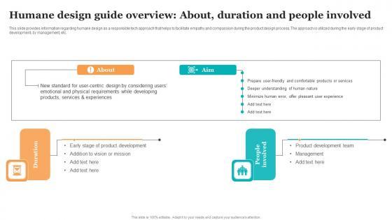 This slide provides information regarding humane design as a responsible tech approach that helps to facilitate empathy and compassion during the product design process. The approach is utilized during the early stage of product development, by management, etc. This modern and well arranged Humane Design Guide Overview About Duration And People Involved Ppt Infographic Template Show PDF provides lots of creative possibilities. It is very simple to customize and edit with the Powerpoint Software. Just drag and drop your pictures into the shapes. All facets of this template can be edited with Powerpoint no extra software is necessary. Add your own material, put your images in the places assigned for them, adjust the colors, and then you can show your slides to the world, with an animated slide included.