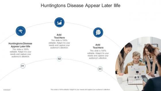 Presenting our innovatively designed set of slides titled Huntingtons Disease Appear Later Ilife In Powerpoint And Google Slides Cpb. This completely editable PowerPoint graphic exhibits Huntingtons Disease Appear Later Ilife that will help you convey the message impactfully. It can be accessed with Google Slides and is available in both standard screen and widescreen aspect ratios. Apart from this, you can download this well structured PowerPoint template design in different formats like PDF, JPG, and PNG. So, click the download button now to gain full access to this PPT design. Our Huntingtons Disease Appear Later Ilife In Powerpoint And Google Slides Cpb are topically designed to provide an attractive backdrop to any subject. Use them to look like a presentation pro.