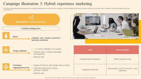This slide showcases personalized experience marketing illustration which can be used by marketers. It provides details about hosts, audience, assets, goal, success metric, moderator, community engagement, brand conversion, etc. From laying roadmaps to briefing everything in detail, our templates are perfect for you. You can set the stage with your presentation slides. All you have to do is download these easy to edit and customizable templates. Campaign Illustration 3 Hybrid Driving Business Success Hosting Experiential Mockup Pdf will help you deliver an outstanding performance that everyone would remember and praise you for. Do download this presentation today. This slide showcases personalized experience marketing illustration which can be used by marketers. It provides details about hosts, audience, assets, goal, success metric, moderator, community engagement, brand conversion, etc.