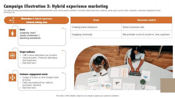 This slide showcases personalized experience marketing illustration which can be used by marketers. It provides details about hosts, audience, assets, goal, success metric, moderator, community engagement, brand conversion, etc. From laying roadmaps to briefing everything in detail, our templates are perfect for you. You can set the stage with your presentation slides. All you have to do is download these easy-to-edit and customizable templates. Campaign Illustration 3 Hybrid Experience Experiential Marketing Technique Pictures PDF will help you deliver an outstanding performance that everyone would remember and praise you for. Do download this presentation today. This slide showcases personalized experience marketing illustration which can be used by marketers. It provides details about hosts, audience, assets, goal, success metric, moderator, community engagement, brand conversion, etc.
