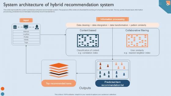 This slide represents the system architecture of hybrid recommender system. The purpose of this slide is to illustrate the working of a hybrid recommender. The key points include input, information processing, predicted recommendation list and top recommended items. Make sure to capture your audiences attention in your business displays with our gratis customizable Recommendation Techniques System Architecture Of Hybrid Recommendation System Pictures PDF. These are great for business strategies, office conferences, capital raising or task suggestions. If you desire to acquire more customers for your tech business and ensure they stay satisfied, create your own sales presentation with these plain slides. This slide represents the system architecture of hybrid recommender system. The purpose of this slide is to illustrate the working of a hybrid recommender. The key points include input, information processing, predicted recommendation list and top recommended items.