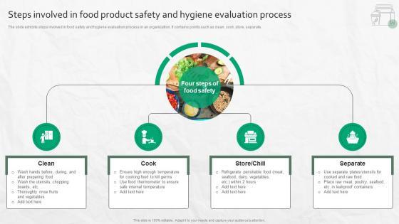 The slide exhibits steps involved in food safety and hygiene evaluation process in an organization. It contains points such as clean, cook, store, separate. Do you have to make sure that everyone on your team knows about any specific topic I yes, then you should give Steps Involved In Food Product Safety And Hygiene Evaluation Process a try. Our experts have put a lot of knowledge and effort into creating this impeccable Steps Involved In Food Product Safety And Hygiene Evaluation Process. You can use this template for your upcoming presentations, as the slides are perfect to represent even the tiniest detail. You can download these templates from the Slidegeeks website and these are easy to edit. So grab these today The slide exhibits steps involved in food safety and hygiene evaluation process in an organization. It contains points such as clean, cook, store, separate.