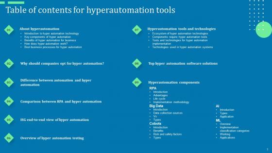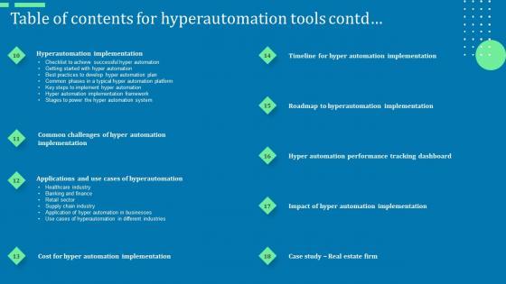 Do you know about Slidesgeeks Table Of Contents For Hyperautomation Tools Ppt Ideas Pdf These are perfect for delivering any kind od presentation. Using it, create PowerPoint presentations that communicate your ideas and engage audiences. Save time and effort by using our pre-designed presentation templates that are perfect for a wide range of topic. Our vast selection of designs covers a range of styles, from creative to business, and are all highly customizable and easy to edit. Download as a PowerPoint template or use them as Google Slides themes. Our Table Of Contents For Hyperautomation Tools Ppt Ideas Pdf are topically designed to provide an attractive backdrop to any subject. Use them to look like a presentation pro.
