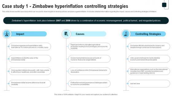 This slide shows real life case study which can be used to draw Insights to develop policies and plans against inflation. It includes detailed information regarding the impact, causes and controlling strategies of inflation. Slidegeeks is one of the best resources for PowerPoint templates. You can download easily and regulate Case Study 1 Zimbabwe Hyperinflation Comprehensive Guide On Inflation Control CM SS V for your personal presentations from our wonderful collection. A few clicks is all it takes to discover and get the most relevant and appropriate templates. Use our Templates to add a unique zing and appeal to your presentation and meetings. All the slides are easy to edit and you can use them even for advertisement purposes. This slide shows real life case study which can be used to draw Insights to develop policies and plans against inflation. It includes detailed information regarding the impact, causes and controlling strategies of inflation.