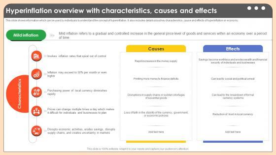 This slide shows information which can be used by individuals to understand the concept of hyperinflation. It also includes details about key characteristics, cause and effects of hyperinflation on economy. Make sure to capture your audiences attention in your business displays with our gratis customizable Hyperinflation Overview With Characteristics Strategies For Inflation A Tactical Guide Fin SS V. These are great for business strategies, office conferences, capital raising or task suggestions. If you desire to acquire more customers for your tech business and ensure they stay satisfied, create your own sales presentation with these plain slides. This slide shows information which can be used by individuals to understand the concept of hyperinflation. It also includes details about key characteristics, cause and effects of hyperinflation on economy.