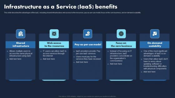 This slide describes the advantages of the IaaS, including shared infrastructure, web access to the resources, pay as per use model, focus on the core business, and on demand scalability.Deliver an awe inspiring pitch with this creative Infrastructure As A Service Iaas Benefits Xaas Cloud Computing Models Ppt PowerPoint Presentation Ideas Rules PDF bundle. Topics like Shared Infrastructure, Demand Scalability, Through Internet can be discussed with this completely editable template. It is available for immediate download depending on the needs and requirements of the user.
