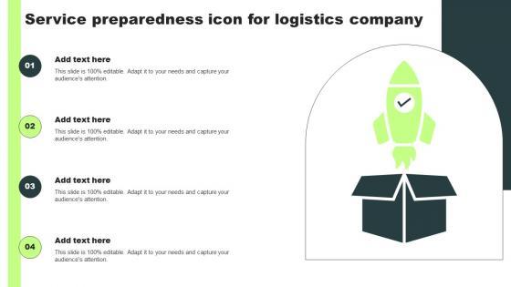 Showcasing this set of slides titled Service Preparedness Icon For Logistics Company Background Pdf. The topics addressed in these templates are Service Preparedness, Icon, Logistics Company. All the content presented in this PPT design is completely editable. Download it and make adjustments in color, background, font etc. as per your unique business setting. Our Service Preparedness Icon For Logistics Company Background Pdf are topically designed to provide an attractive backdrop to any subject. Use them to look like a presentation pro.