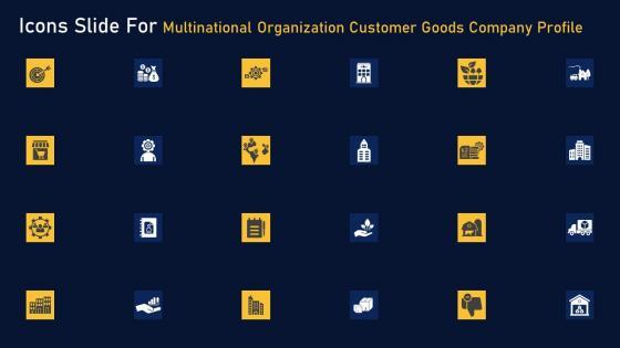 Introducing our well designed Icons Slide For Multinational Organization Customer Goods Company Profile Diagrams Pdf set of slides. The slide displays editable icons to enhance your visual presentation. The icons can be edited easily. So customize according to your business to achieve a creative edge. Download and share it with your audience. Our Icons Slide For Multinational Organization Customer Goods Company Profile Diagrams Pdf are topically designed to provide an attractive backdrop to any subject. Use them to look like a presentation pro.